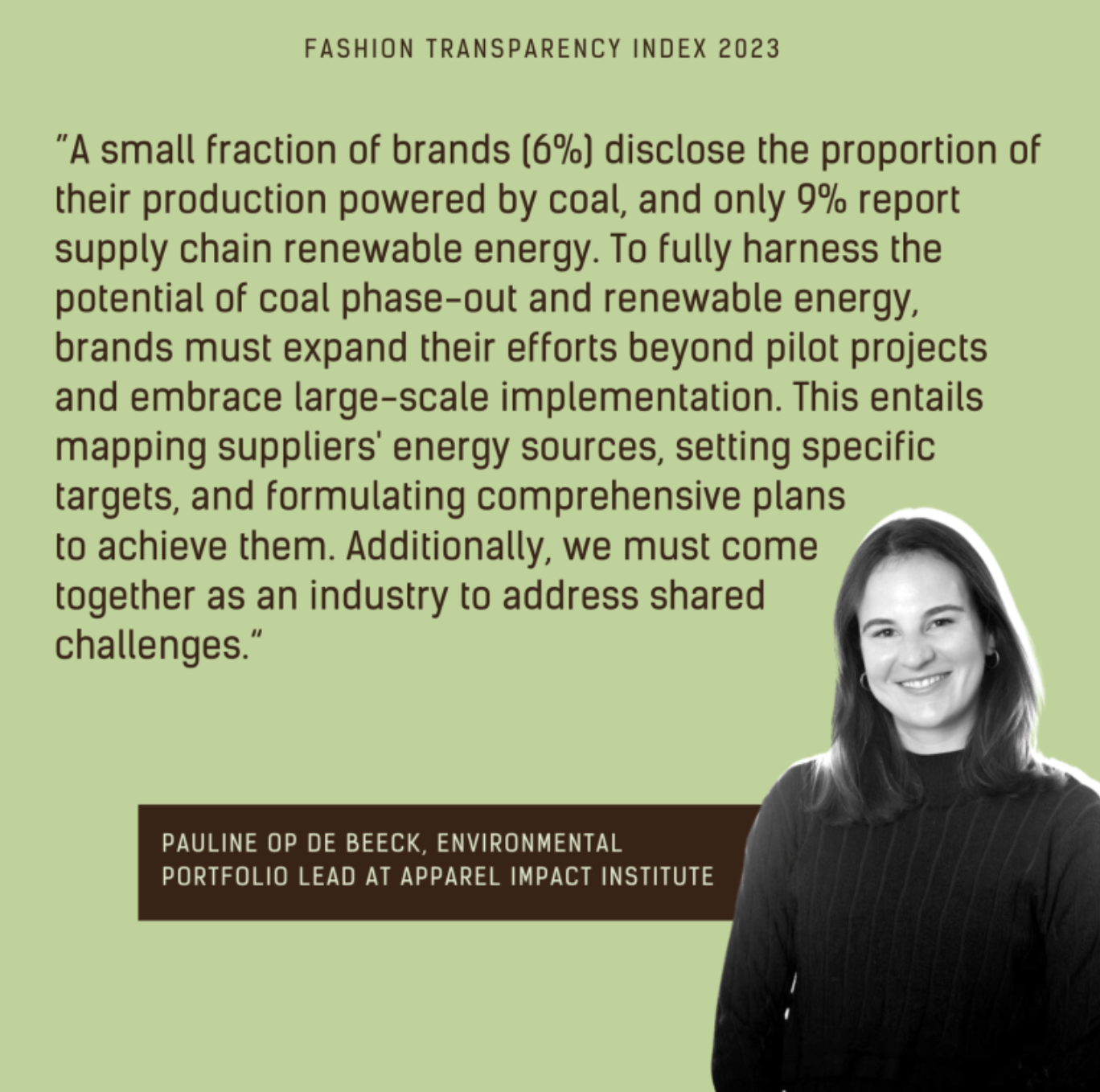 "기후위기의 강도와 시급성은 점점 더 커지고 있지만, 패션업계가 기후위기를 악화시키는 데 기여하는 역할에 대해 충분한 조치를 취하고 있지 않습니다. 이러한 이유로 올해에는 주요 브랜드의 석탄 의존도를 파악하기 위해 새로운 지표를 도입했습니다. 공급망에서 석탄이 차지하는 비율과 화석 연료에 여전히 의존하는 지역을 공개하는 브랜드는 소수에 불과해(6%), 우리가 직면한 문제의 규모에 대한 측정이 불분명합니다. 브랜드가 처음부터 얼마나 많은 석탄을 사용하고 있는지 공개하지 않는다면 어떻게 탈탄소화 약속을 지킬 수 있을까요?"