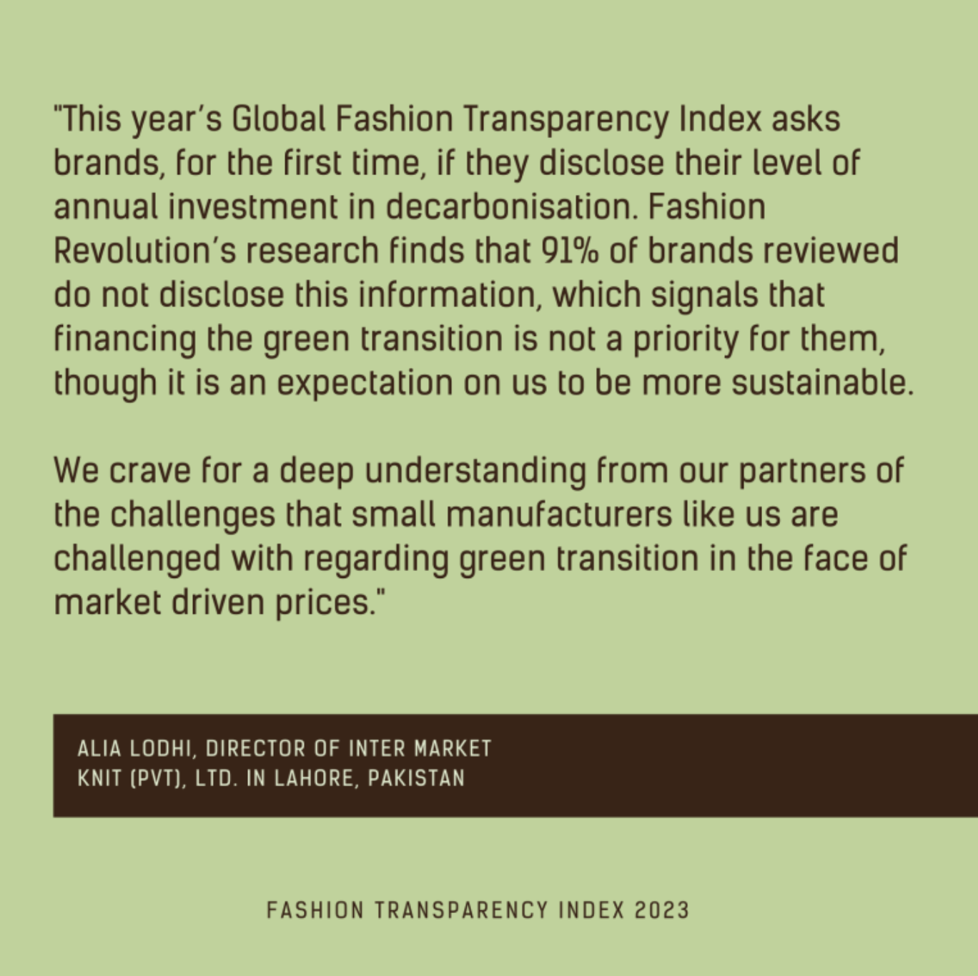 이 문제를 더 깊이 이해하기 위해 다양한 업계 전문가와 이해관계자를 초청하여 친환경 전환에 대해 논의하고, 브랜드가 이러한 변화에 대비할 수 있는 방법과 그 과정에서 공급업체를 지원할 수 있는 방법에 대한 통찰력을 제공했습니다. 여기에서 패션 투명성 지수 2023에 포함된 몇 가지 관점을 살펴볼 수 있습니다.