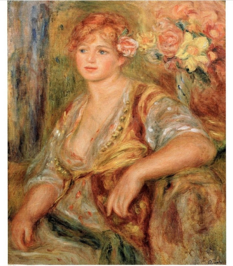 르누아르(1841-1919)는 대표적인 인상주의 작가로 인물을 통해 특히 여인의 육체를 통해 자연에서 오는 빛을 표현했다. 풍만한 여인들의 신체와 얼굴에서 오는 행복감. 눈매에서 흘러나오는 미소와 뽀얀 우유빛 살결을 외설적이지 않게 우아하게 묘사하는 마법을 부린다. 르누아르는 중년이후부터 류머티스성 관절염의 악화로 심한 통증으로 휴양을 하며 남프랑스에서 생활을 한다. 생이 끝날때까지 살았던 그곳에서 관절염과 사투하면서도 그의 그림은 더욱 무르익어 간다. 말년에 그는 지팡이없이는 걸을수 없고 손발을 쓰지 못하는 상황이 되지만 휠체워에서 끈으로 붓을 손에 묶어 그림을 그렸다고 한다.