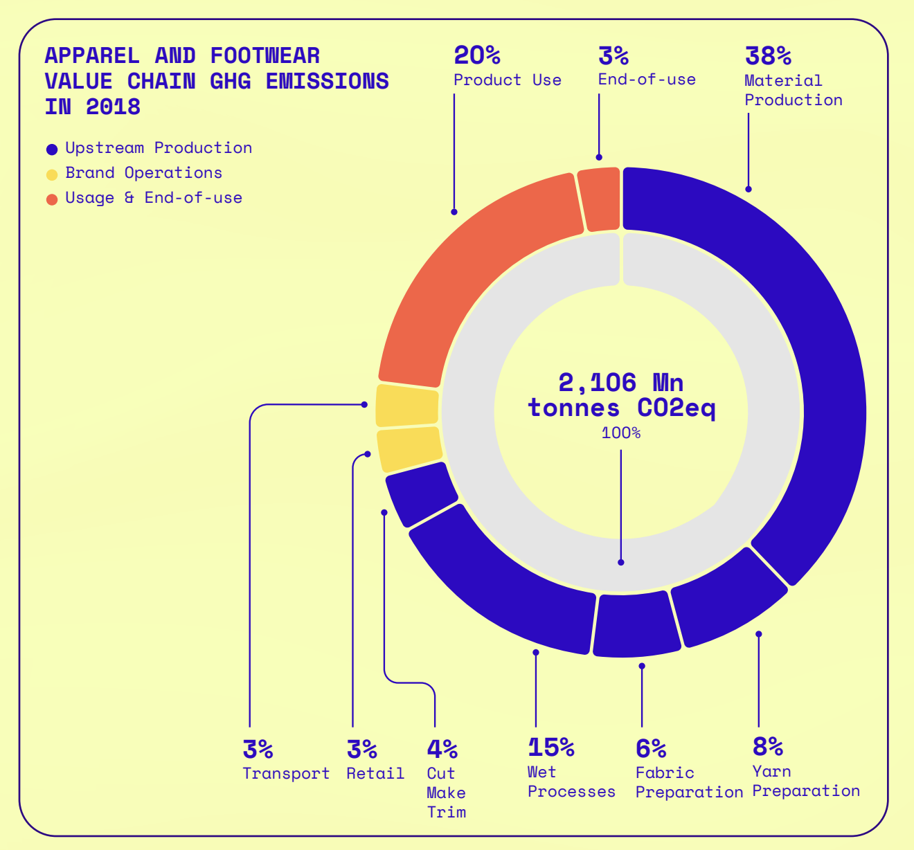 대부분의 의류는 면, 셀룰로오스, 폴리에스터와 같은 합성섬유 및 가죽으로 만들어진다. 그 중 레이온, 나일론, 폴리에스터와 같은 합성소재는 전체의류의 거의 64%를 차지하며 이것은 화석연료로 만들어지며 패스트패션이 보편화 되면서 그 비율이 더 증가하고 있다. 최근 발표된 섬유거래소 보고서에 따르면 화석 기반 합성물질 생산량이 증가 하고 있다고 힌다. 이렇게 생산된 옷은 세탁할 때마다 미세플라스틱이 물에 방출되며 눈에 보이지 않는 미세한 입자가 물로 분해되면서 동물과 식물에 영향을 주기에 매우 중요한 문제가 된다. 이 보고서는 패션 업계의 업계의 온실가스 배출량을 분석하고 기후 목표 달성을 위해 집중할 수 있는 분야에 대해 설명한다. 온실가스 배출량 데이터를 삼각 측량하고, 현재 및 가속 궤적을 분석한 후 파리 목표 달성을 위한 격차를 정량화함으로써 업계의 탈탄소화 잠재력에 대한 통찰력을 제공하고 앞으로 나아가기 위한 권장 사항을 제시한다.