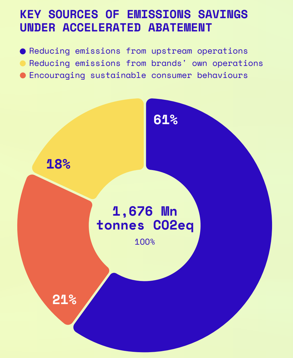 시나리오 2. 가속화된 감축 : 향후 10년간 1.5도 경로에 맞추기 위해, 패션 업계는 노력을 강화해야 한다. 실제로 이는 연간 배출량을 현재의 절반 수준인 약 11억 톤으로 줄일 수 있는 가속화 감축을 수용하는 것을 의미한다.22 가속화 감축의 즉각적인 초점은 브랜드와 소매업체의 협력 노력을 통해 특히 재생 에너지 사용 증가를 통해 배출량의 약 60%를 절감할 수 있는 업스트림 운영에 맞춰져야 한다. 브랜드 자체 운영과 관련된 조치는 약 20%의 감축을 달성할 수 있는 잠재력을 가지고 있으며, 나머지는 소비자 행동의 변화에서 비롯된다. 2030년까지 이러한 노력을 통해 의류 5개 중 1개가 순환 비즈니스 모델을 통해 거래되는 등 패션 업계가 크게 변화해야 한다.