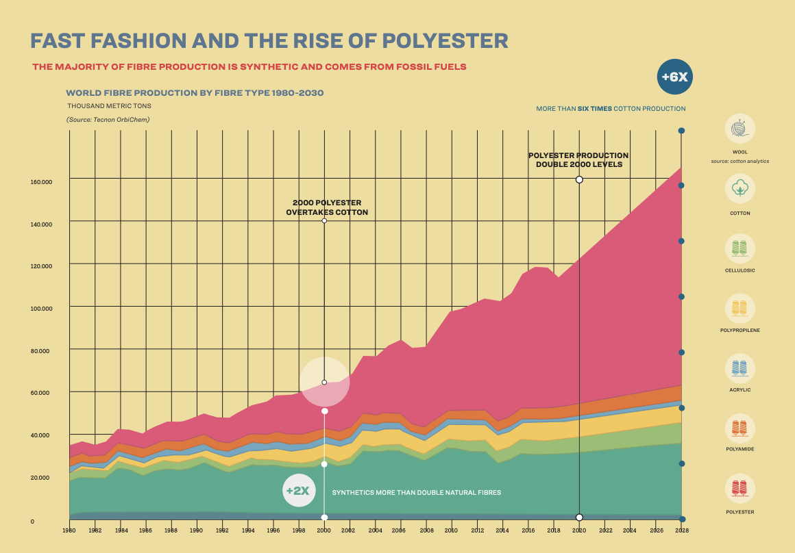 값싼 합성 섬유는 저품질 의류를 만들어 폐기물로 버려지기 때문에 해로울 뿐만 아니라, 기후 비상 상황에서도 화석 연료 추출에 대한 패션 업계의 의존도를 지속시킨다. 운송 및 에너지 부문의 석유 및 가스 수요가 감소함에 따라 석유 및 가스 산업은 생존을 위해 석유화학의 성장에 점점 더 많은 기대를 걸고 있다. 2030년에는 합성 섬유가 섬유 생산량의 73%를 차지할 것으로 예상되며, 이 중 85%가 폴리에스테르이다. 이는 지난 50년 동안 폴리에스테르 생산량이 거의 9배나 증가한 추세의 연장선상에 있는 것이다. 미래를 위해 산업이 바라보아야 하는 방향과 정반대의 방향으로 산업을 움직이고 있는 것이다. 이 시점의 가장 좋은 해결책은 한 섬유를 다른 섬유로 대체하는 것이 아니라 이 속도를 늦추는 것이다. 그것을 위해 감당할 수 없는 양의 폐기물, 유해한 미세 섬유 및 광범위한 오염을 알려야 한다.
